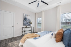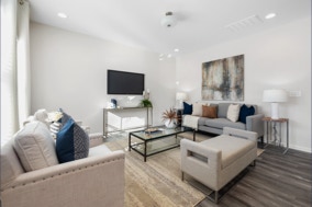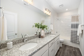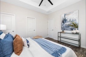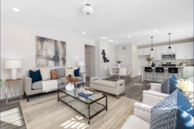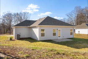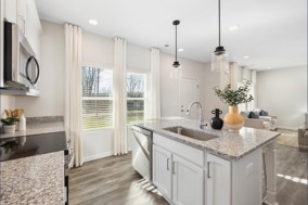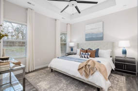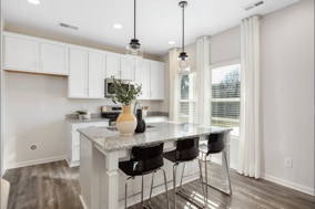 This lovely ranch-style home boasts three bedrooms and two bathrooms, featuring a contemporary open-concept design. The kitchen is adorned with a striking island complemented by sleek solid surface countertops, complete with soft-closed doors and drawers and charming pendant lighting. The luxurious on-suite bathroom features an elegant tile shower surround, while the secondary bathroom offers a generously sized double bowl vanity, both finished with stunning tile surround accents. The primary bedroom also features a beautiful oversized ceiling fan for added comfort and style. The entire home is complete with custom window blinds, providing privacy and a sleek finishing touch.