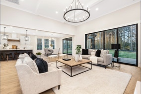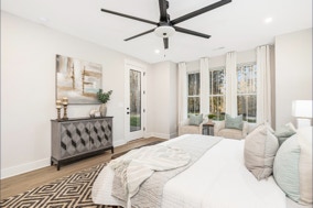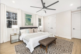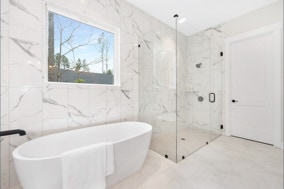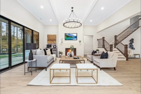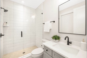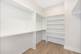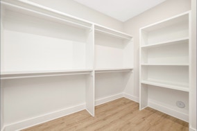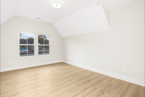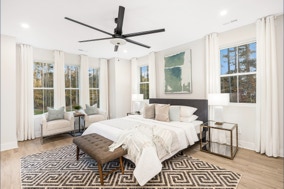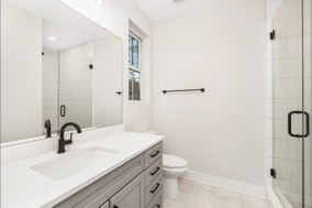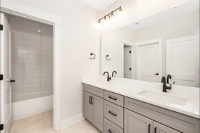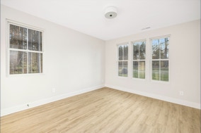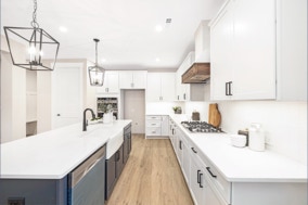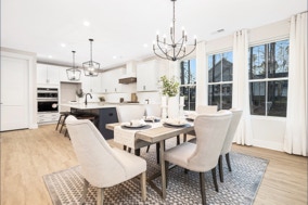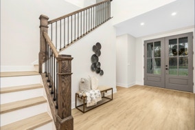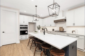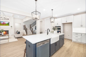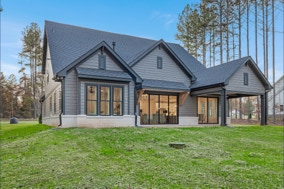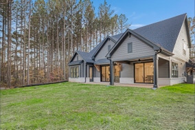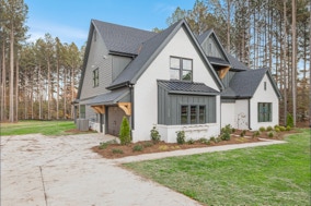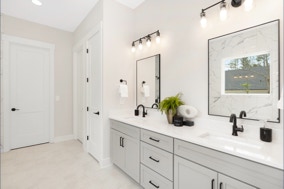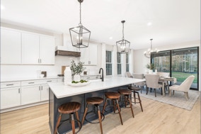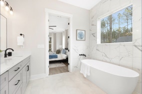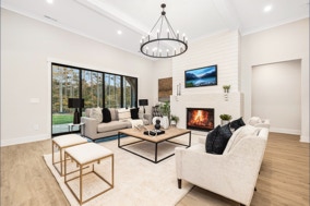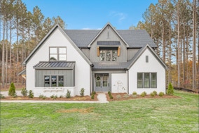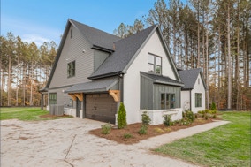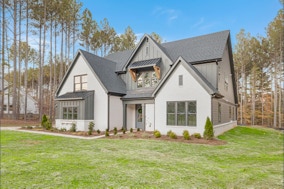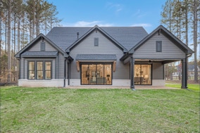Elegant brick-front modern farmhouse. Open story-and-a-half home featuring primary suite and a full guest suite on the main level. Equally efficient and beautiful, this home features a decorator-inspired kitchen with white perimeter kitchen cabinets and a contrasting kitchen island with elegant white marble-style quartz countertops to complete the look. Beautiful painted brick and shiplap fireplace in great room. LVP flooring throughout, with tile floors in all baths & laundry. Modern farmhouse-style interior trim with solid core wood doors, and the stairway features LVP treads with wrought iron balusters.